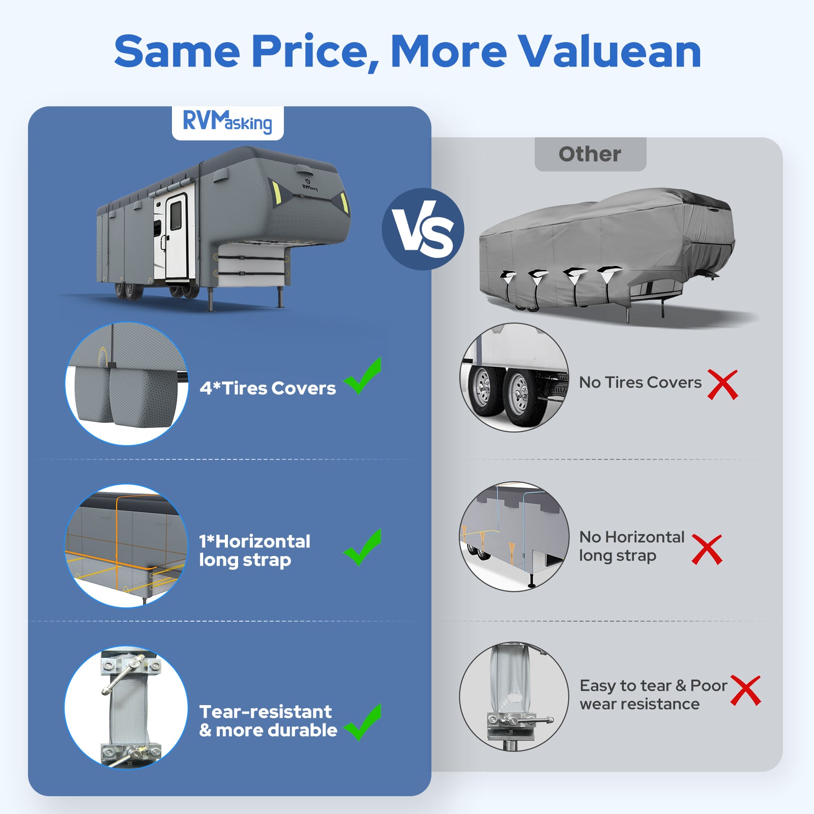 - 30% Increased Durability - Upgraded from old version with only small patches on 4 or 8 bottom corners, our 5th wheel rv cover protect 8 corners with extra-long reinforced patches. Larger patches design minimizes the risk of punctures and tearing from sharp edges. Plus, The rear corner patches are heightened to protect against ladder edges, further preventing tears. With thicker fabric and thoughtful design, we ensure better user experience and product lifespan