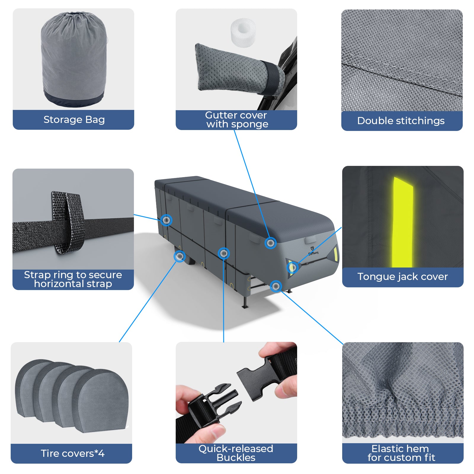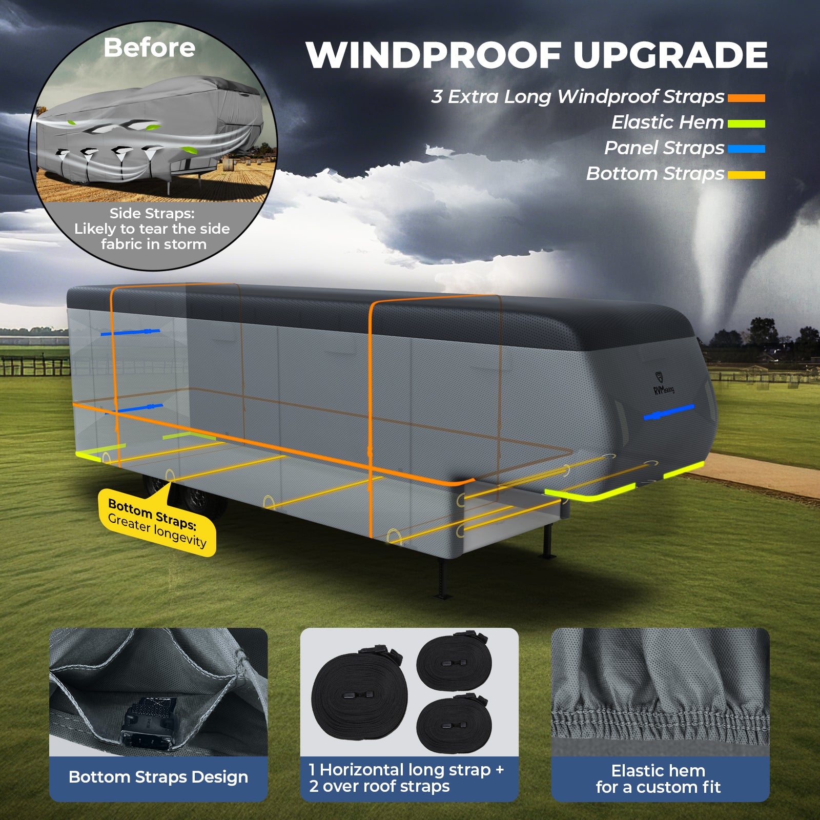 - Enhanced Wind Protection - Alongside two over roof straps, we include an extra-long horizontal strap that wraps around the bottom of your RV to prevent wind from entering and causing the cover to billow and tear. Additional bottom windproof straps, bottom around elastic hem, and front and rear tension panel straps ensure a snug fit tailored to your RV’s shape. Enjoy peace of mind knowing your 5th wheel trailer is protected with a secure fit every time