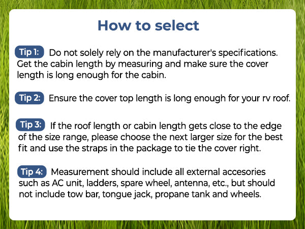 - Tire Cover & Abundant accessories - Package includes 4 tire covers, so you don’t need to purchase them separately. Plus, it comes with ①a thoughtful detailed instruction specially designed for 5th wheel trailer guides you step-by-step through the setup process, ②6 gutter spout covers to protect the sharp gutter for RV, ③2 weighted toss metal sticks for easier strap installation, ④a repair patch for minor rips